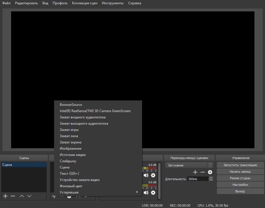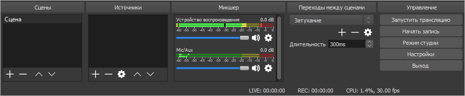Откройте главное окно OBS Studio и создайте сцены. К примеру, «Заглушка», «Прямой эфир», «Перерыв», «Конец».