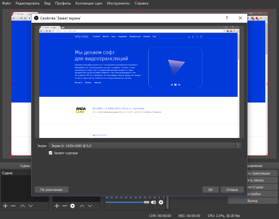 С помощью программы Open Broadcaster Software (OBS) можно публиковать поток со своего компьютера в Flussonic Media Server. Это может использоваться для стриминга игр, вебинаров и любых других трансляций с компьютера в интернет.
