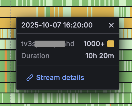 Ниже в группе Stream details есть несколько графиков: ошибки, трафик, предупреждения, dvr. Они все нужны для планомерной работы с потоками. Ошибки и предупреждения о проблемах мы разнесли, чтобы вам было удобнее отделять критические проблемы от потенциальных.